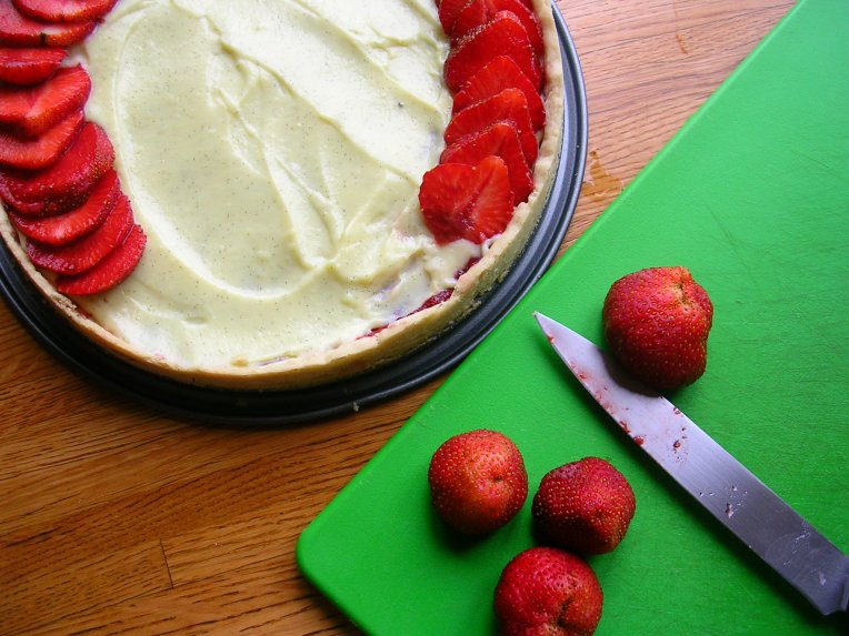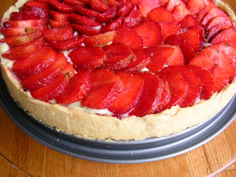 Fortunately, our neighbor, a part-time farmer, grows strawberries. He has supplied us with super-ripe strawberries twice this week. This strawberry cake was an impromptu operation so I used what I had on hand. For the lining of the crust, I made a small batch of strawberry jam of the ripest strawberries. Unless it’s top-quality or homemade, I find most strawberry jams nothing but sugary so this was more than a solution borne out of necessity.