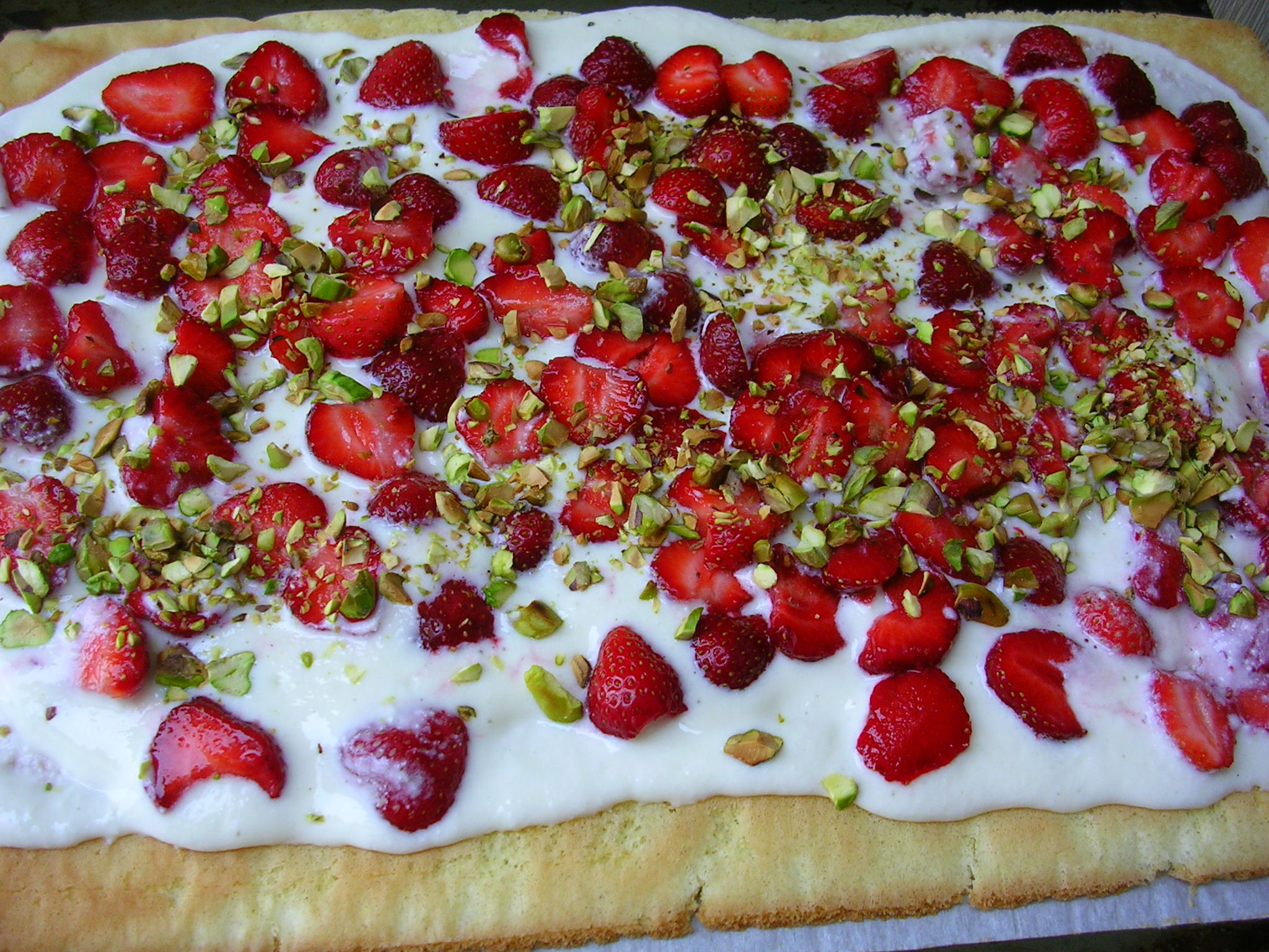 11. Spread the ricotta evenly over the sponge cake, leaving about ½ inch uncovered on the long sides. Spread the sliced strawberries on top and sprinkle with the pistachios.