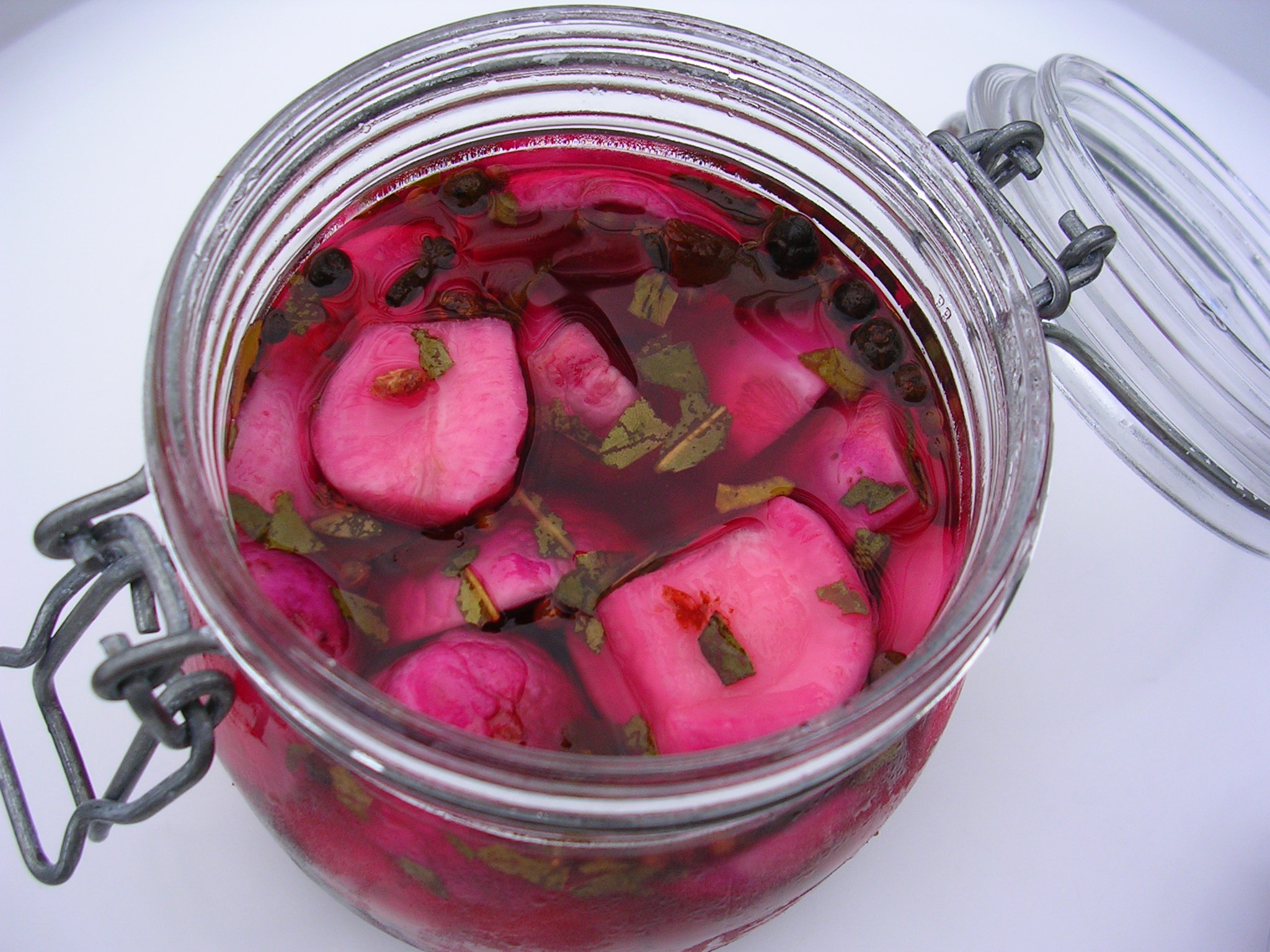 This is a „short-order pickle“ – one that should be eaten within a couple of days. The radishes do get wrinkly but that’s just looks. A word of caution: the smell is quite strong, although not much stronger than a good ripe cheese. The two of them taste good together, too.