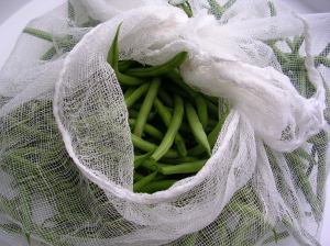 After we took out half of our pots and colanders of various sizes and staged the different options, it occurred to me that cheesecloth might be the way to go. I placed a pound of green beans on a large piece of cheesecloth, twisted it several times at the top so it formed a loose bag around the beans, and lowered it into a large pot of the boiling water. I firmly held onto the top with a pair of tongs. When I immersed the bag into the bowl with ice water, it cooled off almost instantly so I could open up the cloth and release all the beans.