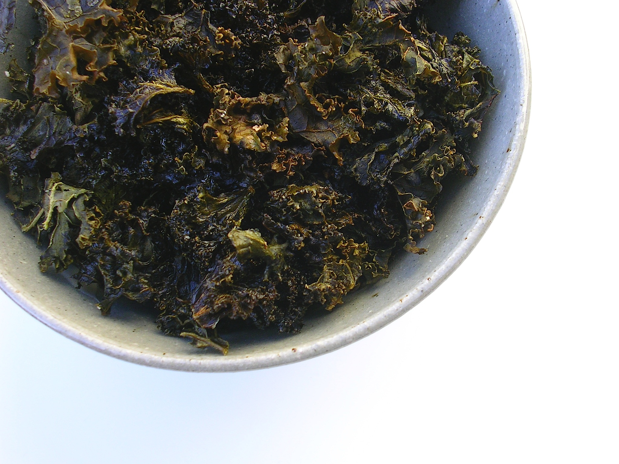 These kale chips are addictive. They are very easy to make but require a bit of time, as you need to stand by and make sure they don’t burn. After I charred one batch I decided to leave them in the switched-off oven for the night; this morning, they were perfect.