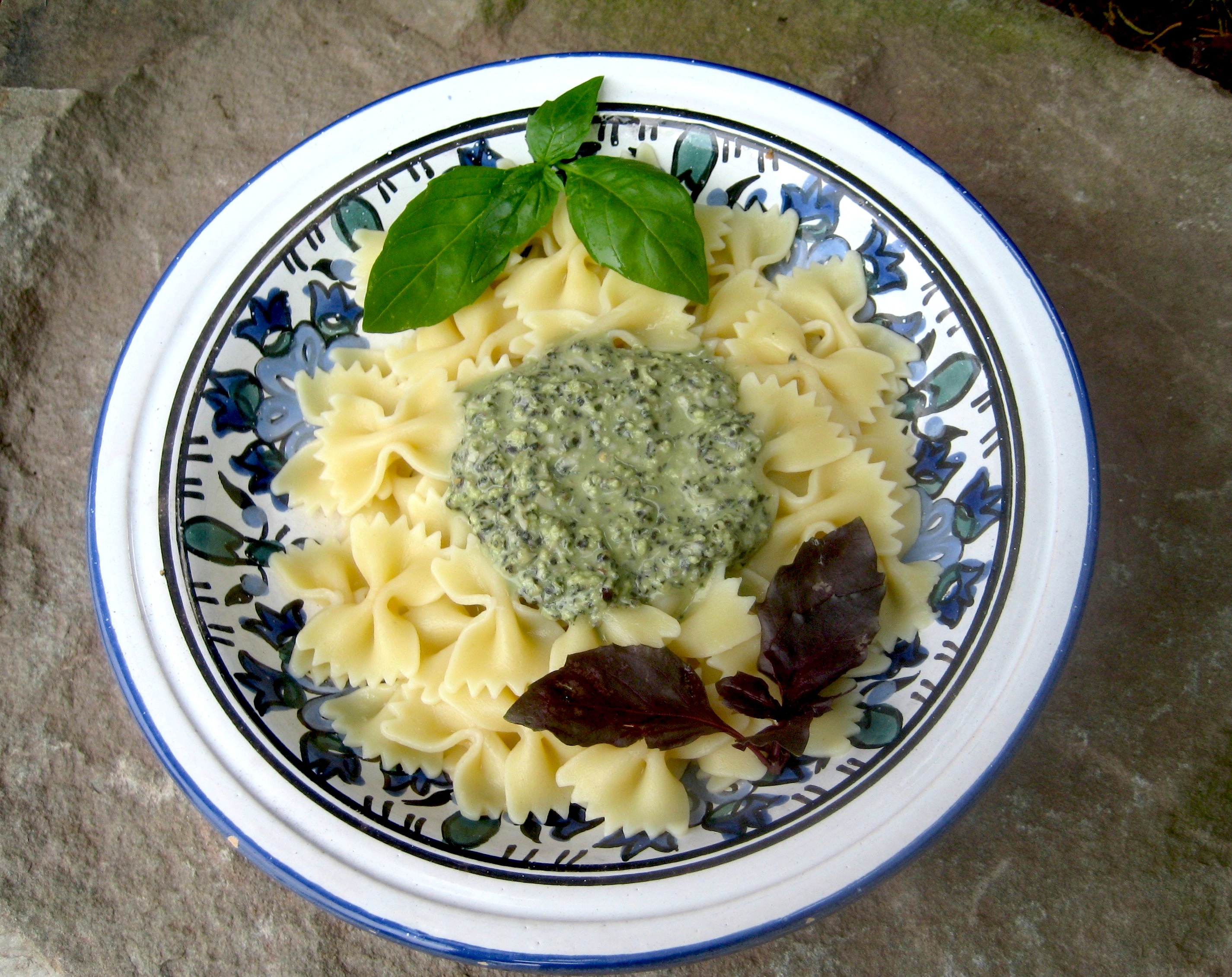 Looking at the abundance of green and opal basil in my garden today I remembered a cold basil cream sauce I used to make when I was a student. It was a quick and inexpensive dish (in Germany, unlike in the US, crème fraîche can be found in every supermarket, and it’s cheap). Yet the sauce tasted like gourmet food compared to the frozen pizza and other stuff on which I mostly survived.