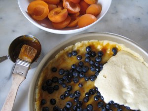 As I was lining up all the ingredients, I started revolting. One whole stick butter for the filling, in addition to the stick already required for the crust… that is too much butter for my taste in a tart where fresh fruit should be the star. So I concocted an alternative batter, substituting the butter with milk and using confectioners’ sugar instead of sugar to make it smoother. I also separated the eggs and beat the whites stiff for a fluffier consistency. Finally, since I did not have ½ cup apricot jam for the glaze (since I make our own jam, I try to avoid buying any), I made my own using two extra apricots.