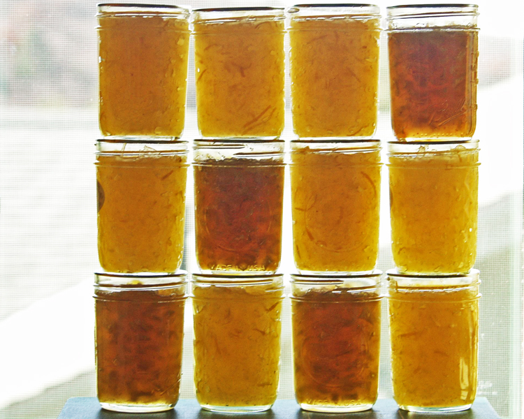 7. Ladle the jam into sterilized jars with screwtop lids. Let cool and close jars. Store in the refrigerator and use within a month.