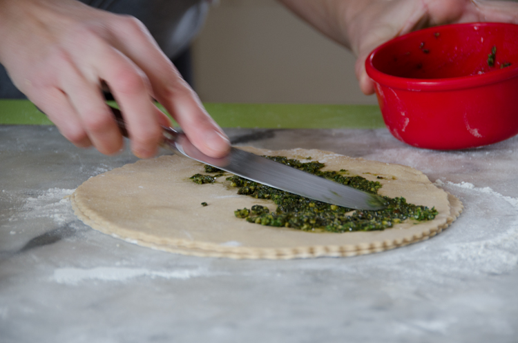 6. Add the dough scraps to the remaining dough and knead until smooth. Add a few teaspoons of water if the dough seems dry. Roll out the second half of the dough and cut out two more dough circles as described. Place the second circle on top of the first and spread it with pesto as described. Place the last circle on top and leave it plain.