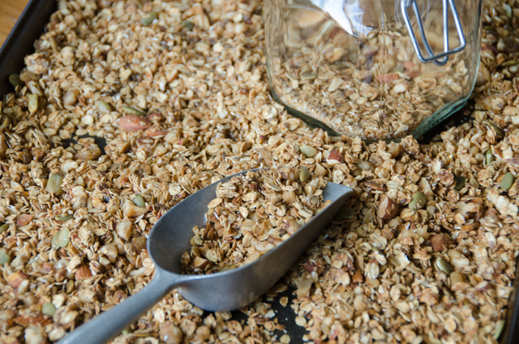 I either combine sunflower seeds and walnuts, or pumpkin seeds and hazelnuts or almonds. How you mix it is entirely up to personal taste.