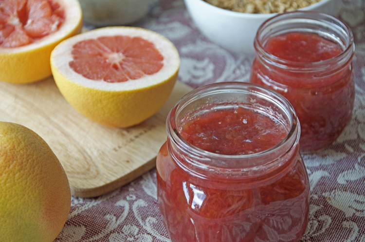 I had always wanted to try my hands on rhubarb grapefruit jam and I still had a bag of rhubarb from the garden in the freezer. When it snowed and snowed last weekend and cabin fever hit, the vibrant jam brought a much welcome splash of color.