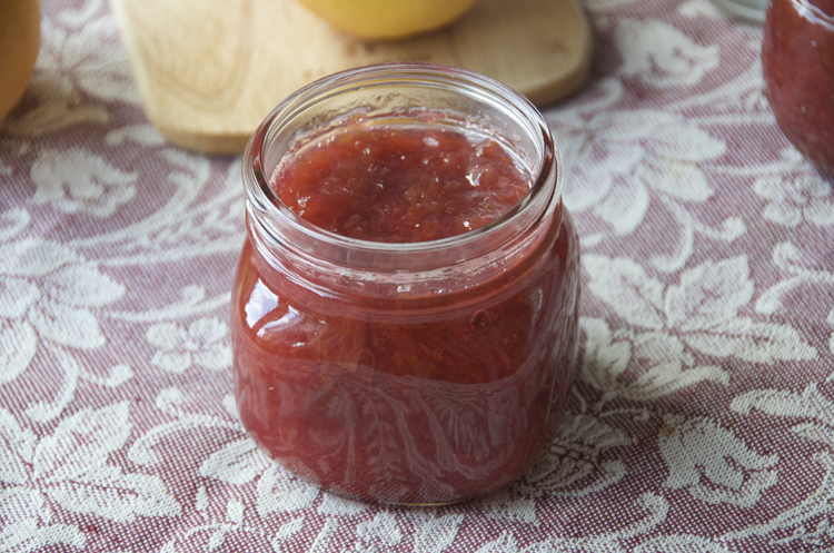6. Fill the piping hot jam into sterilized jars placed on a damp kitchen towel, leaving about ½ inch (1.25 cm) headspace. Wipe the rims of the jars with a damp piece of paper towel to remove any drips. Place the lids and the bands on the jars and process in a boiling water bath for 10 minutes.