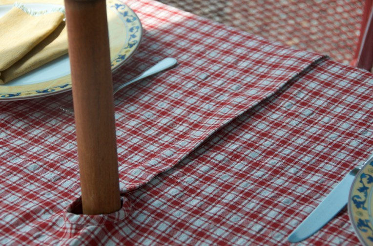 The brand-new fabric found in my uncle’s apartment opened a world of opportunities. I wanted to turn it into something special but also practical for daily use. Our patio table could use a tablecloth, after my husband had drilled a hole in his home-built cedar table so it would fit an umbrella, any of the normal tablecloths did not fit any longer. The table needed a tablecloth with an umbrella hole and a zipper.