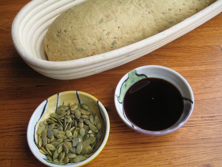 I just pulled a large loaf of bread from the oven. This is a new variation with pumpkin seeds and pumpkin seed oil, my latest culinary discovery and a specialty from Austria. I was lucky enough to find the real thing at our local supermarket for a decent price.