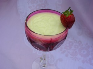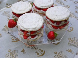 7. Whip the heavy cream with the vanilla sugar. Spread half of it on four meringue circles and arrange sliced strawberries on top. Place a second meringue circle on each and repeat with the remaining cream and strawberries. Place the last meringue circles on top. Serve right away, or refrigerate for a few hours but serve the same day.