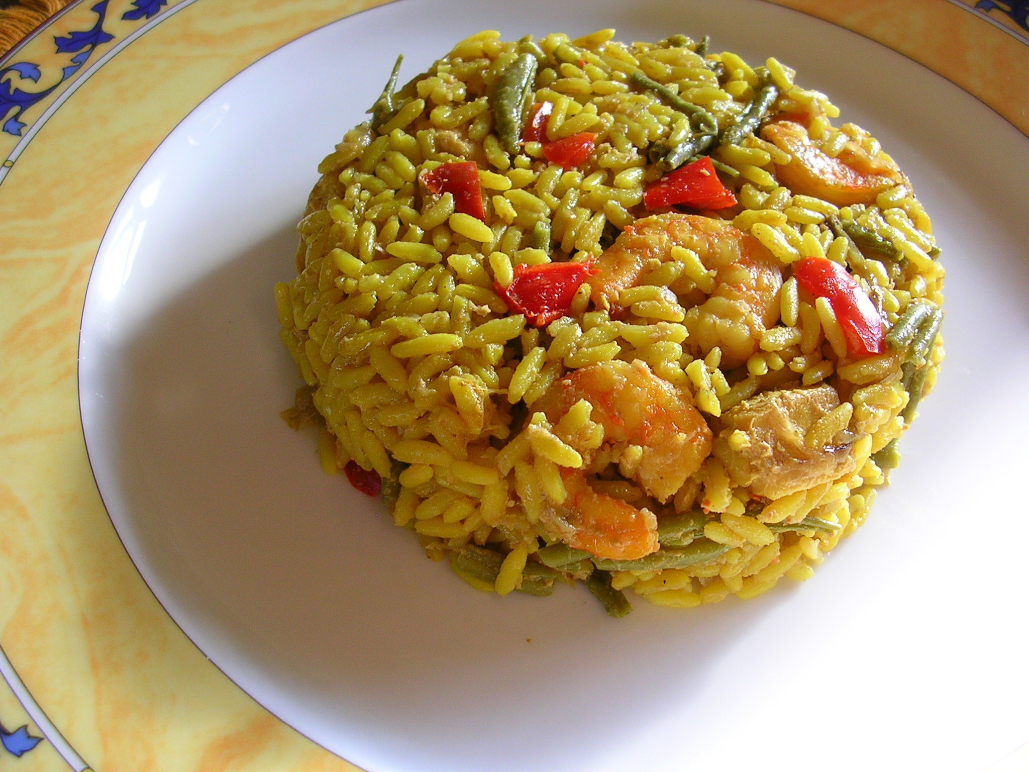 This recipe is adapted from Paella, Fast and Easy in Mark Bittman’s The Minimalist Cooks at Home. I doubt whether Mr. Bittman would agree with my using yellow rice mix from the package but since I adhere to most of what he advocates so passionately, I hope he would let this one slip.