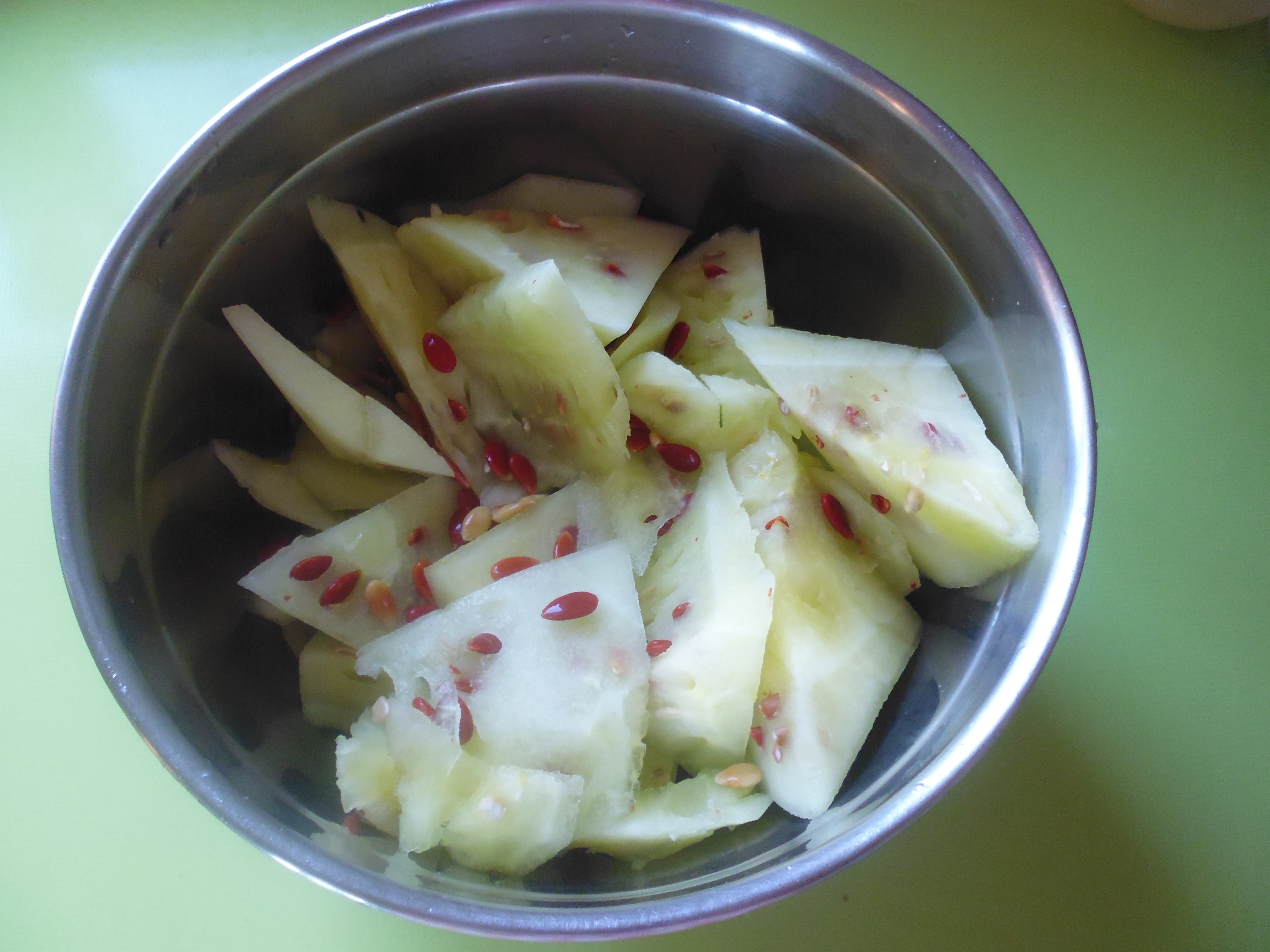 2012 had been a terrible year in my garden for all members of the cucumber family. I had almost none or no cucumbers, zucchini (yes, that is possible), melons, and winter squash. This year I decided to overplant everything, including the citron melons. My goal was to have one melon so at least I would know how it tastes.