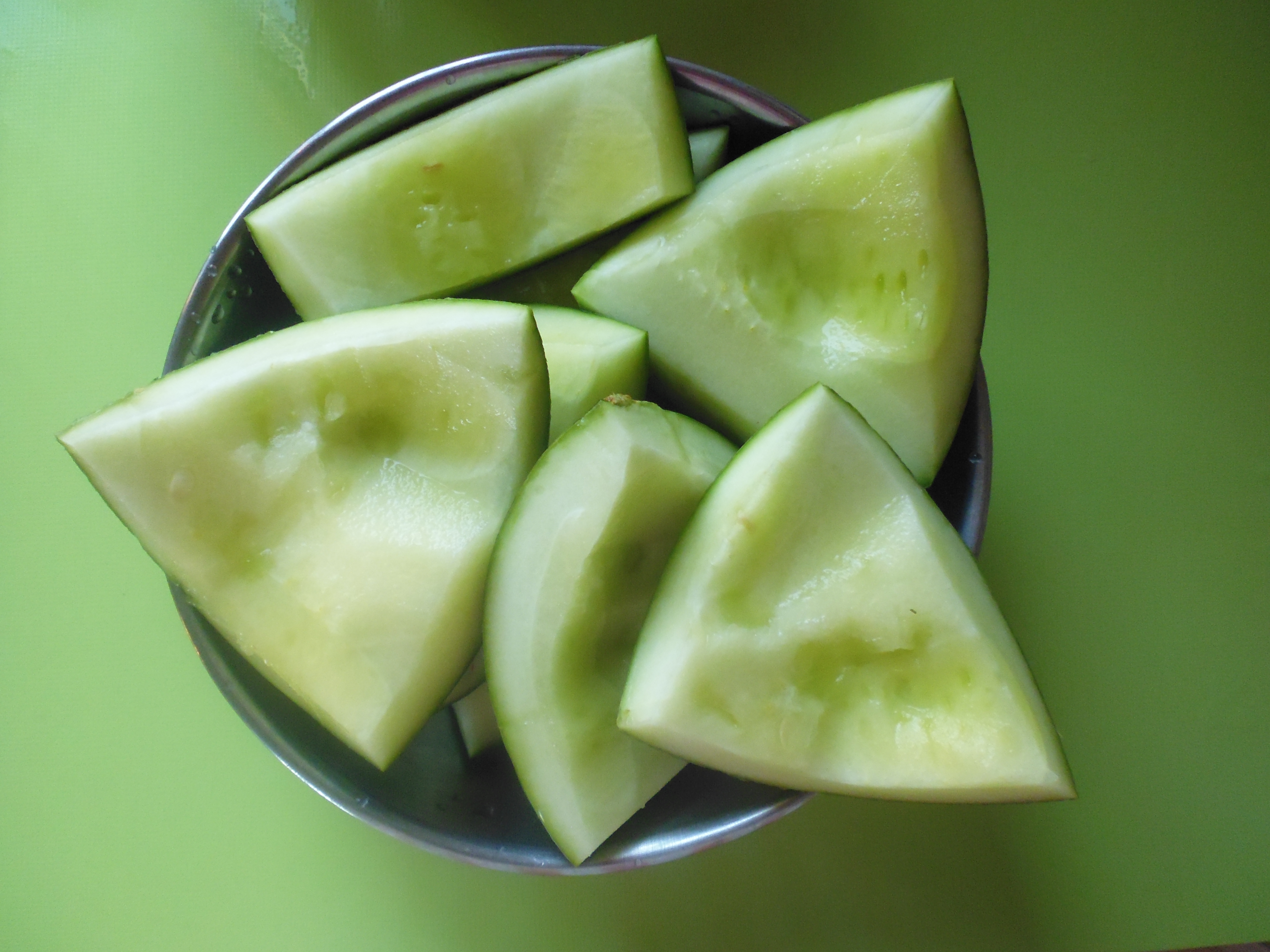 I could not find the seeds in the United States but came across A Gardener’s Table (funny coincidence!), a blog by food writer Linda Ziedrich. She had written about growing citron melon so I sent her an email asking where she got the seeds. The seeds are not commercially available but she offered to mail me some of the ones she had saved. I wanted to reciprocate but did not have any unusual seeds for her. Instead I asked if she would like some of my yearly allotment of dark chocolate that my mother in Germany had just sent me. Seeds then traveled from the West Coast to the East Coast, and chocolate in the other direction.