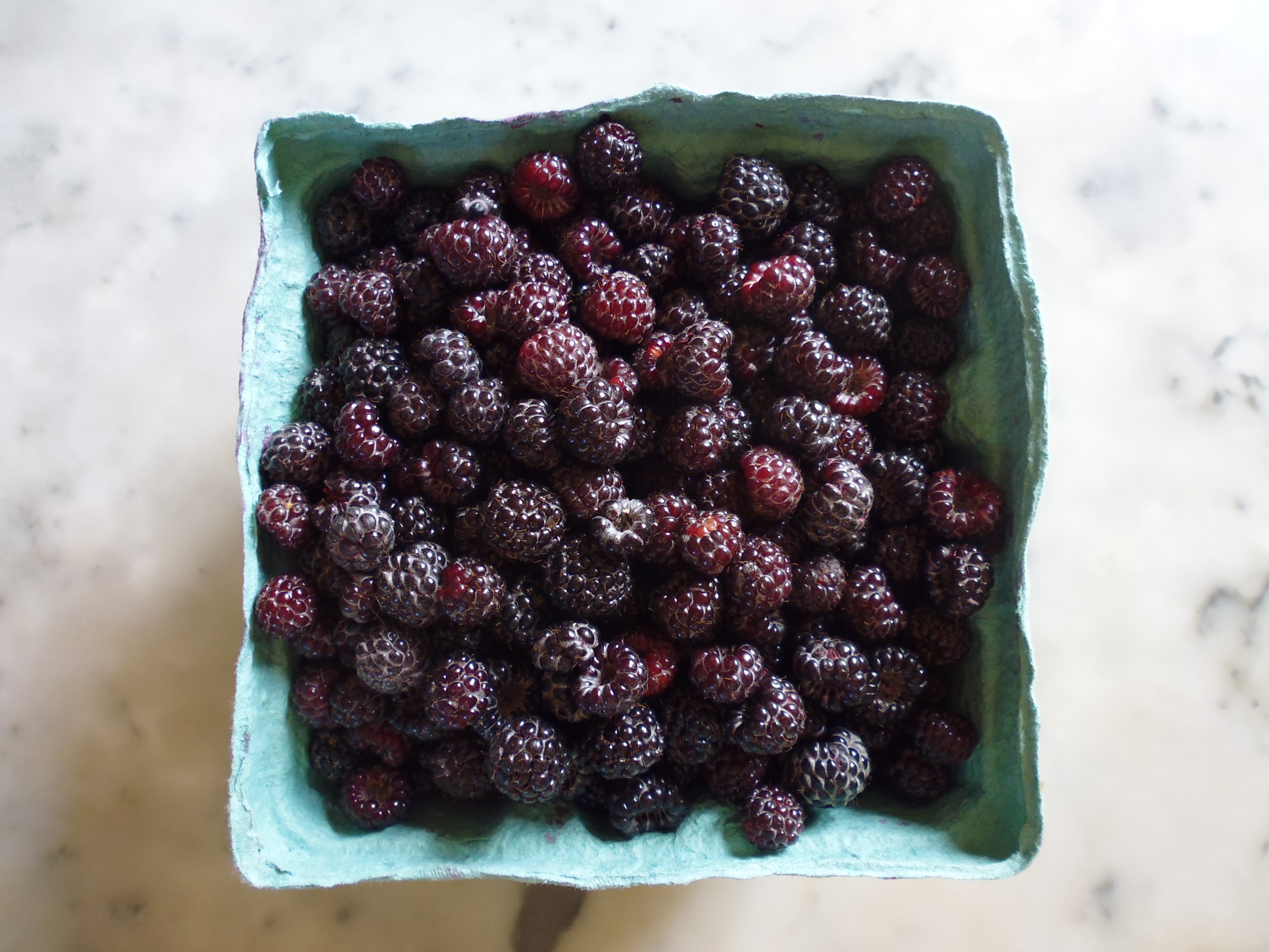 We have a few black raspberries on our grounds, usually not enough to get excited about. This year however seemed different. I spotted brambles full of berries and picked a handful for fruit tart the other day, making a note to myself to get more. It took me a few days to work up the energy to leave my cool office and actually do it – in 90 degrees Fahrenheit and 55 percent humidity, covered up head to toe with boots, long sleeves, hat, protective glasses, and gloves. Even the dog, usually following me everywhere and inching forward with me sphinx-style when I pick strawberries, preferred to stay in the house.